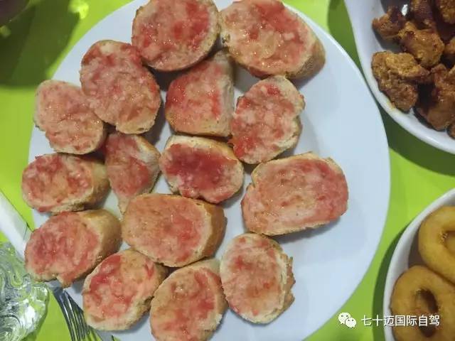 其实就是涂满番茄salsa的烤面包片,会用橄榄油、海盐和大蒜稍稍调味,是Tapas最常见的配食,用来搭配伊比利亚火腿等偏咸的食物再合适不过。