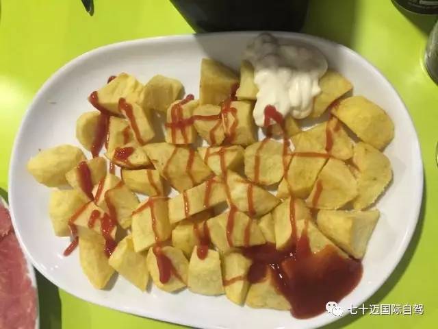 这个应该也是酒吧最常见的Tapas了,炸到外皮酥脆的土豆块,搭配两种酱汁——大蒜蛋黄酱与辣味番茄酱。此外,炸土豆也是很多Tapas的基底,像烤香肠、炸小鳗鱼等等,都用炸土豆块来做垫菜。