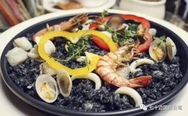 在海鲜饭的系列中还有一种墨鱼汁海鲜饭。西班牙当地人管它叫海鲜黑饭。米饭发黑的原因就是因为使用了黑色的墨鱼汁。